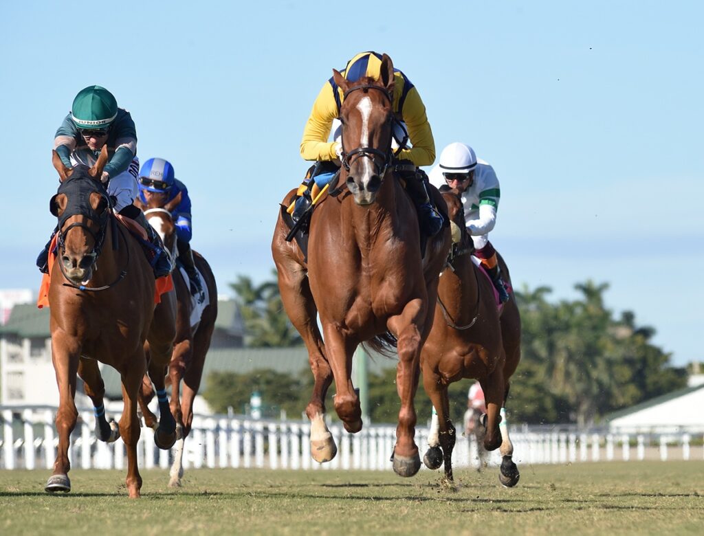 A la altura de la novena competencia de este sábado 11 de febrero, se celebrará en la pista de Tampa Bay Downs el Suncoast Stakes ($150,000), un clásico donde hará su primera actuación como tresañera la recientemente galardonada con el Premio Eclipse como Mejor Dosañera de la temporada anterior, la potra Wonder Wheel (Into Mischief). Esta será conducida por Tyler Gaffalione y tendrá el entrenamiento de Mark Casse.